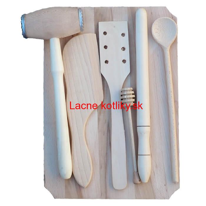 dosku na krájanie, kladivko na mäso, 2 obracačky, naberačku na med, varechu a valček na cesto.