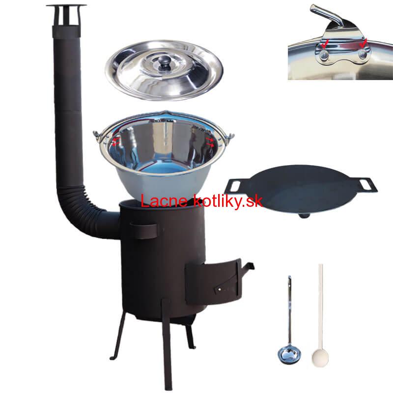 Kotlíková súprava na varenie gulášu , pečenie a grilovanie klobás, steakov, špekáčikov, slaniny, mäsa, zeleniny a iných pochutín v záhrade, v prírode pre rodiny, rôzne spoločenské akcie a posedenia pri dobrom guláši a grilovaní.